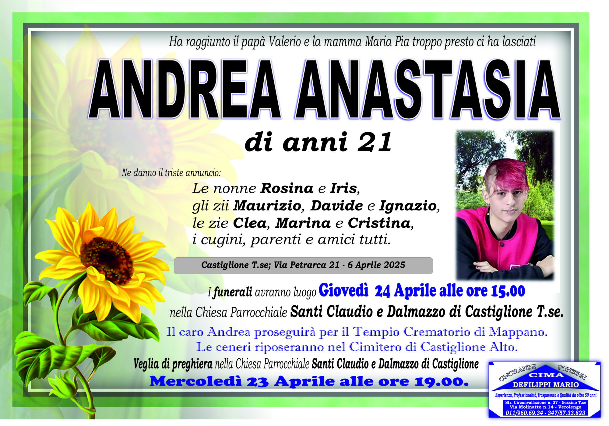 ANDREA ANASTASIA di anni 21 Lascia un pensiero, sarà nostra cura farlo prevenire alla famiglia Annulla rispostaIl tuo indirizzo email non sarà pubblicato. I campi obbligatori sono contrassegnati *Commento * Nome Email Sito web Salva il mio nome, email e sito web in questo browser per la prossima volta che commento.