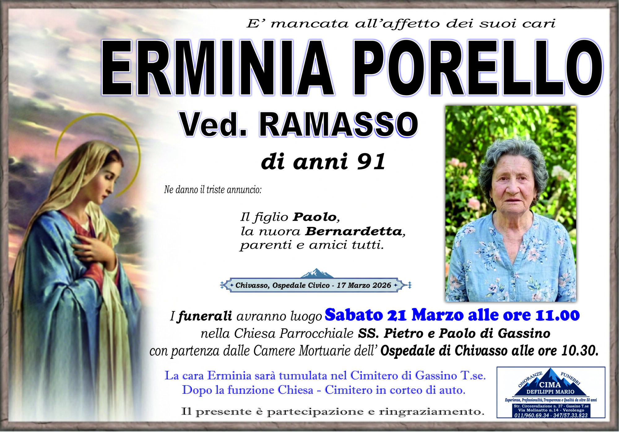 ERMINIA PORELLO VEd. RAMASSO di anni 91 Lascia un pensiero, sarà nostra cura farlo prevenire alla famiglia Annulla rispostaIl tuo indirizzo email non sarà pubblicato. I campi obbligatori sono contrassegnati *Commento * Nome Email Sito web Salva il mio nome, email e sito web in questo browser per la prossima volta che commento.