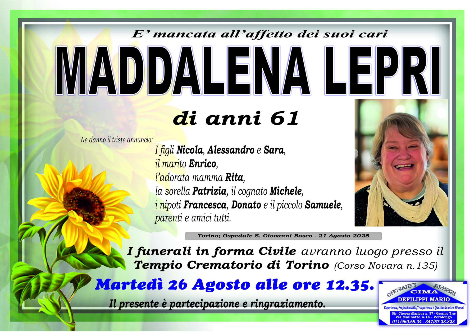 MADDALENA LEPRI di anni 61 Lascia un pensiero, sarà nostra cura farlo prevenire alla famiglia Annulla rispostaIl tuo indirizzo email non sarà pubblicato. I campi obbligatori sono contrassegnati *Commento * Nome Email Sito web Salva il mio nome, email e sito web in questo browser per la prossima volta che commento.